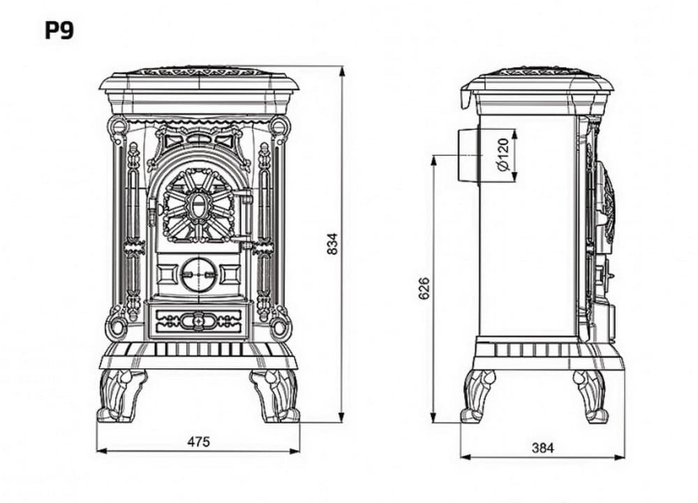 Піч KAWMET P9 ECO з якісного чавуну вигідно відрізняється наявністю регулюванням подачі повітря через гвинтовий клапан в передній частині, а також декоративну кришку, що відкривається, під якою плита для підігріву їжі в посуді.